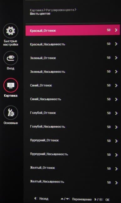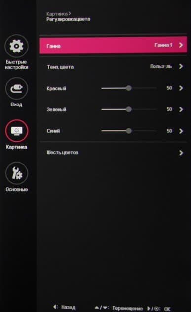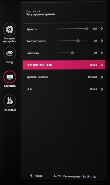 Присутствуют стандартные настройки Яркость, Контрастность и Четкость. Есть функция улучшения изображения с низким разрешением Super Resolution+. В списке выбирается профиль гамма-коррекции, а цветовой баланс корректируется выбором одного из трех профилей цветовой температуры или ручной регулировкой интенсивности трех цветов, а также оттенка и насыщенности шести цветов.