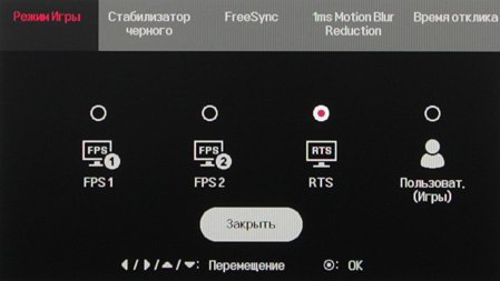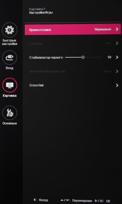Отдельно вынесены игровые настройки — управление разгоном матрицы, включение/выключение AMD FreeSync, регулировка яркости темных оттенков, вставка черного кадра (1ms Motion Blur Reduction) и экранный прицел (Cross Hair).