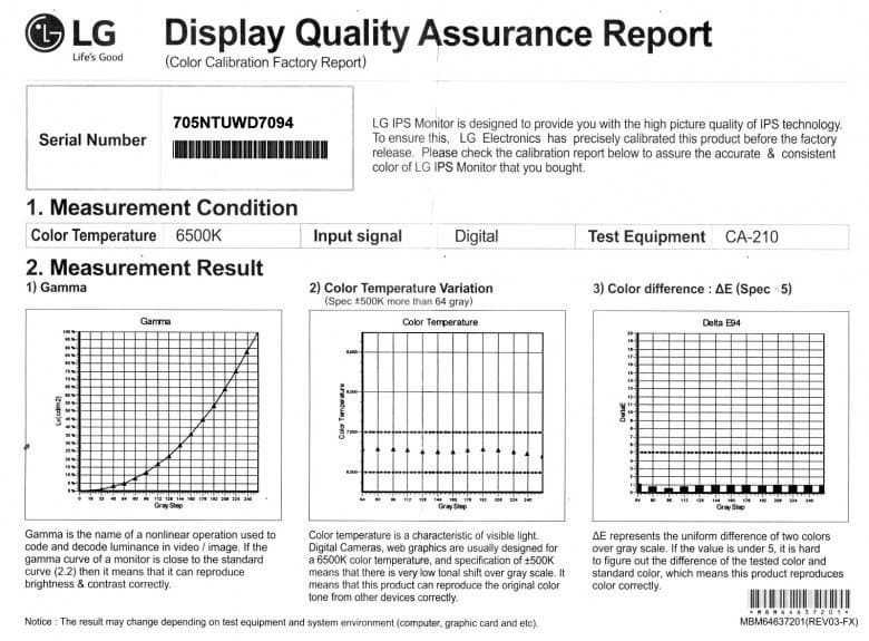 Цветопередача при выборе, например, профиля Пользовательский и варианта Теплый для цветовой температуры удовлетворит не очень требовательного пользователя. К монитору прилагается отчет о заводской калибровке: