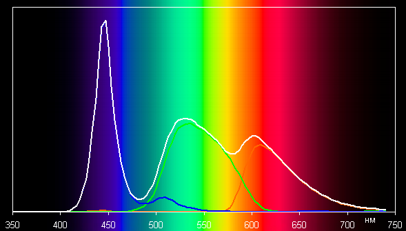 Такой спектр с относительно узким пиком синего и с широкими горбами зеленого и красного цветов характерен для мониторов, в которых используется светодиодная подсветка с синим излучателем и желтым люминофором.