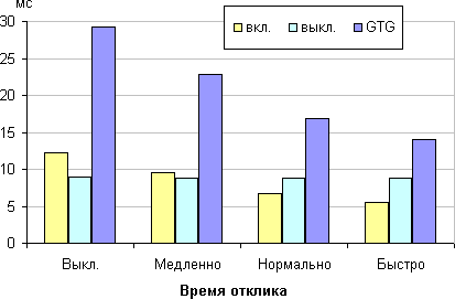 Время отклика зависит от значения одноименной настройки, которая управляет разгоном матрицы. Ступени регулировки четыре. График ниже показывает, как меняется время включения и выключения при переходе черный-белый-черный (столбики вкл. и выкл.), а также среднее суммарное время для переходов между полутонами (столбики GTG):