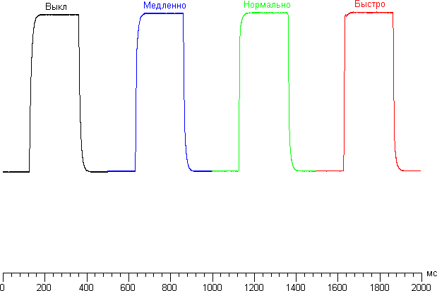 Ниже приведены графики полутонового перехода между оттенками 40% и 60% и обратно при различных значениях настройки Время отклика (по вертикали — яркость, по горизонтали — время, для наглядности графики выстроены последовательно):