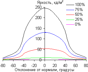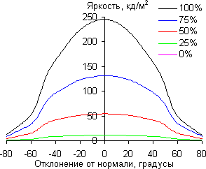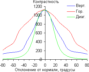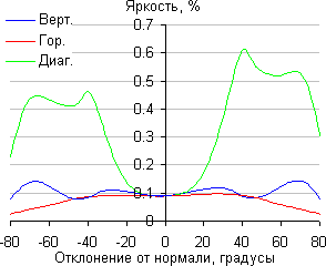 Отметим плавное уменьшение яркости при отклонении от перпендикуляра к экрану в горизонтальном направлении, при этом графики не пересекаются во всем диапазоне измеряемых углов. Заметно быстрее падает яркость при отклонении в вертикальном направлении. При отклонении в диагональном направлении поведение яркости оттенков имеет промежуточный характер между вертикальным и горизонтальным направлениями, за исключением яркости черного поля, которая начинает резко возрастать уже при 20°-30° отклонения от перпендикуляра к экрану. Если сидеть от экрана на расстоянии 50-60 см, то черное поле по углам будет заметно светлее, чем в центре. Контрастность в диапазоне углов ±82° в случае отклонения по диагонали приближается к отметке 10:1, но не опускается ниже.