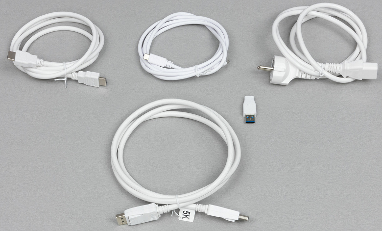 Монитор оснащен встроенным блоком питания. В большинстве случаев это удобно, и только при выходе из строя блока питания внешний БП было бы менять/ремонтировать удобнее и дешевле. Все комплектные кабели — белого цвета, что сочетается с цветом задней панели корпуса монитора.