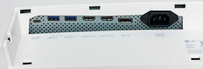 Монитор оснащен четырьмя цифровыми входами: DisplayPort в полноразмерном варианте, двумя HDMI и многофункциональным USB типа C. Последний работает как видео/аудиовход и вход концентратора USB, и может выдавать на подключенное устройство (ноутбук к примеру) до 85 Вт мощности. В комплект поставки включен переходник USB (вилка типа A (3.0) на розетку типа С), чтобы пользователи, в ПК которых нет разъема USB-C, могли использовать концентратор монитора, не покупая дополнительный кабель. В меню можно отключить подачу тока на USB в режиме ожидания.