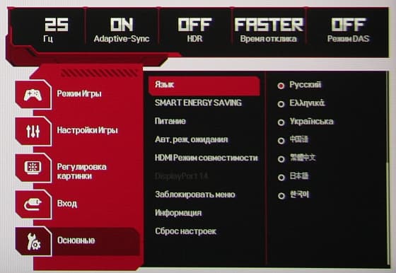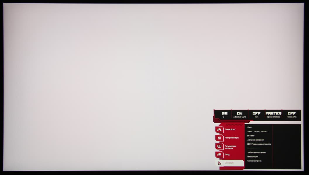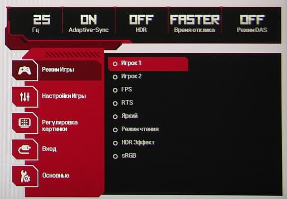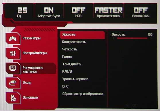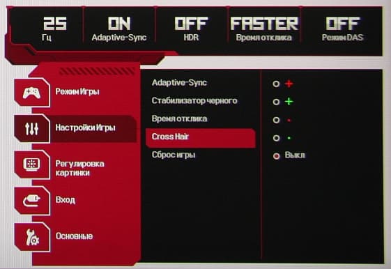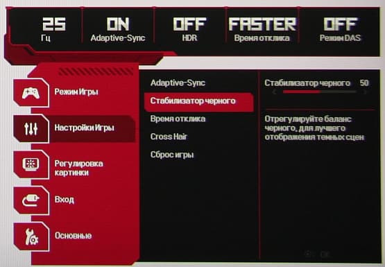 В дополнение к выбору профиля гамма-коррекции есть настройка (Стабилизатор черного), изменяющая различимость градаций в тенях, что может пригодиться в играх с темными сценами. Также можно регулировать разгон матрицы и включать/выключать поддержку режима FreeSync.