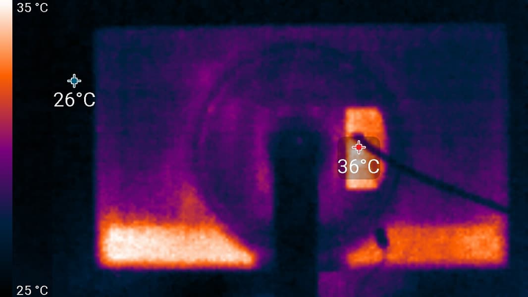 Нагрев монитора можно оценить по приведенным снимкам с ИК-камеры, полученным после долговременной работы монитора на максимальной яркости в помещении с температурой примерно 24 °C:
