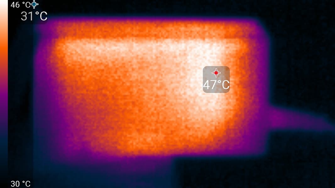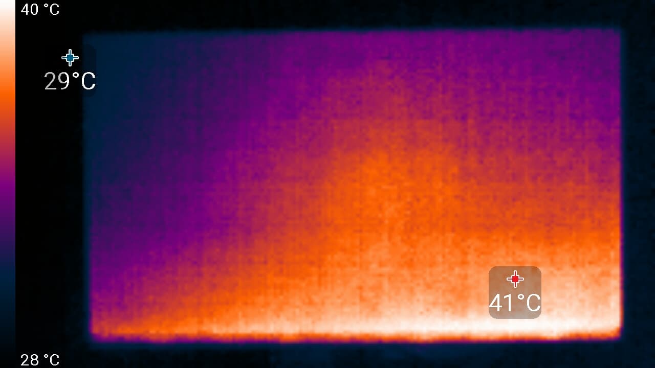 Нижний край экрана нагрелся до 41 °C максимум. Видимо, внизу находится светодиодная линейка подсветки экрана. Нагрев сзади умеренный: