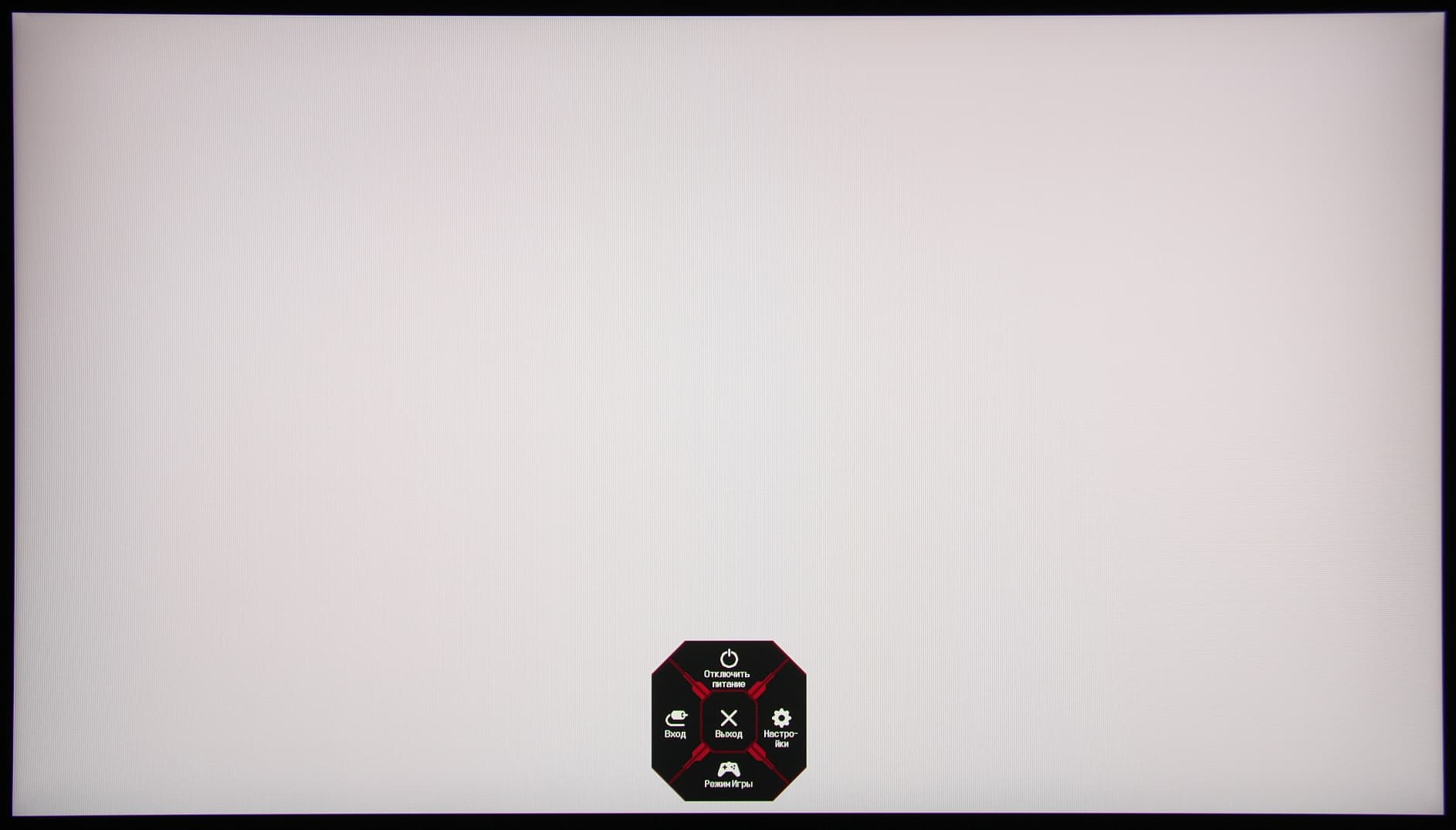 Длительное нажатие, когда нет меню, выключает монитор. Короткое — включает. Из стартового меню можно выйти, перейти к выбору входа, к основному меню, к списку выбора игрового режима (профиля изображения) или выключить монитор. Меню занимает на экране значительную площадь, что иногда мешает оценке вносимых изменений.