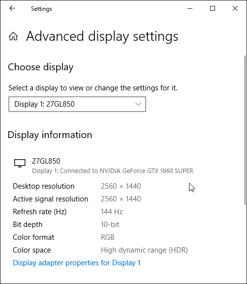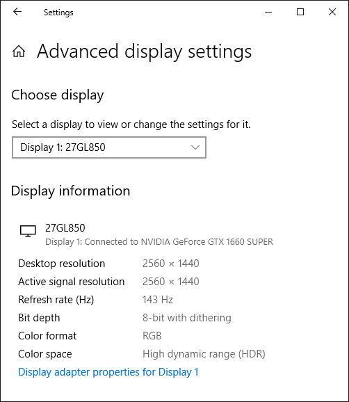 При подключении к компьютеру по DisplayPort и HDMI поддерживалось разрешение до 2560×1440 при 144 Гц кадровой частоты на вход, и вывод изображения на экран также осуществлялся с этой частотой. При таком разрешении и частоте обновления поддерживается вывод а режиме 8 бит на цвет (кодирование RGB) в случае HDMI и 10 бит на цвет в случае DisplayPort.