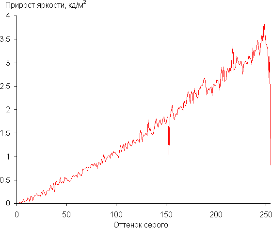 Реальная гамма-кривая ближе всего к стандартной при выборе Режим 4, поэтому далее мы измерили яркость 256 оттенков серого (от 0, 0, 0 до 255, 255, 255) при этом значении. График ниже показывает прирост (не абсолютное значение!) яркости между соседними полутонами:
