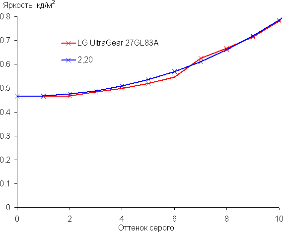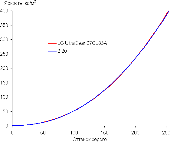 Аппроксимация (уже по 256 точкам) полученной гамма-кривой дала показатель 2,20, что равно стандартному значению 2,2, при этом реальная гамма-кривая мало отклоняется от аппроксимирующей степенной функции: