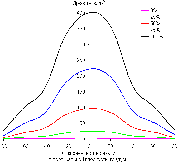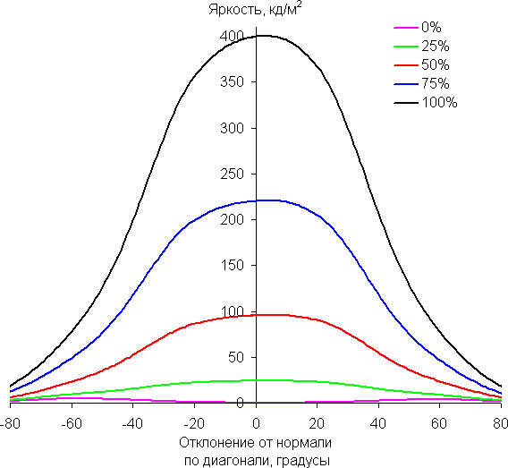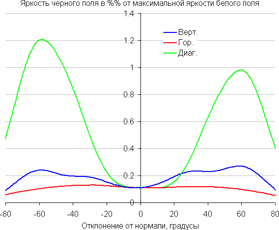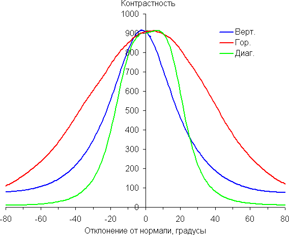 Отметим плавное уменьшение яркости при отклонении от перпендикуляра к экрану в горизонтальном направлении, при этом графики не пересекаются во всем диапазоне измеряемых углов. Чуть быстрее падает яркость при отклонении в вертикальном направлении. При отклонении в диагональном направлении поведение яркости оттенков имеет промежуточный характер между вертикальным и горизонтальным направлениями, за исключением яркости черного поля, которая начинает резко возрастать уже при 20°-30° отклонения от перпендикуляра к экрану. Если сидеть не очень далеко от экрана, то черное поле по углам будет заметно светлее, чем в центре. Контрастность в диапазоне углов ±82° в случае отклонения по диагонали приближается к отметке 10:1, и опускается ниже при отклонении более, чем на 78° в одном направлении.