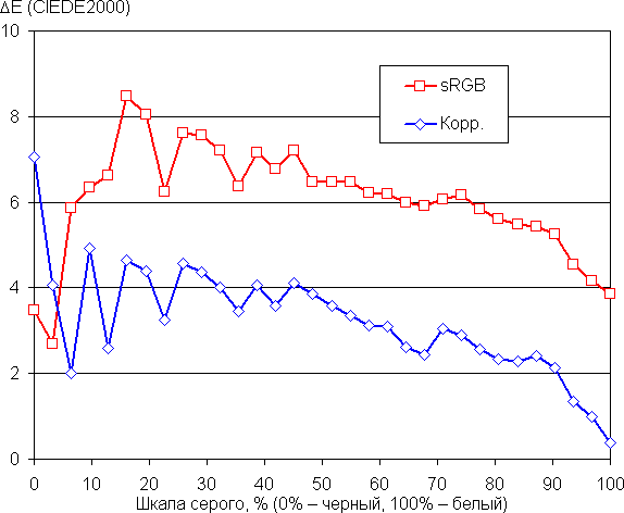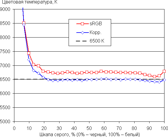 Самый близкий к черному диапазон можно не учитывать, так как в нем цветопередача не так важна, а погрешность измерения цветовых характеристик высокая. Ручная коррекция еще больше приблизила цветовую температуру к 6500 К и уменьшила значение ΔE. Впрочем, для бытового применения просто выбрать профиль sRGB уже достаточно.