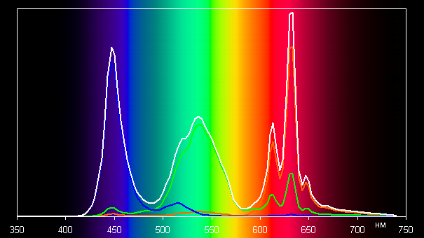 Поэтому визуально цвета на этом мониторе имеют естественные насыщенность и оттенок. Ниже приведен спектр для белого поля (белая линия), наложенный на спектры красного, зеленого и синего полей (линии соответствующих цветов):