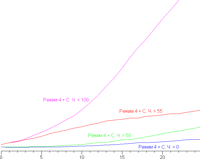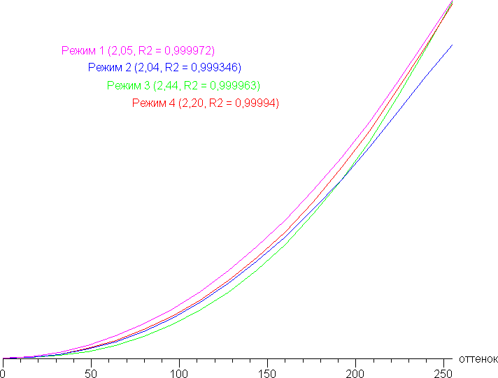 Реальная гамма-кривая зависит от выбранного профиля (Режим 1 — 4) в списке Гамма (значения показателей аппроксимирующей функции приведены в скобках в подписях, там же — коэффициент детерминации R²):