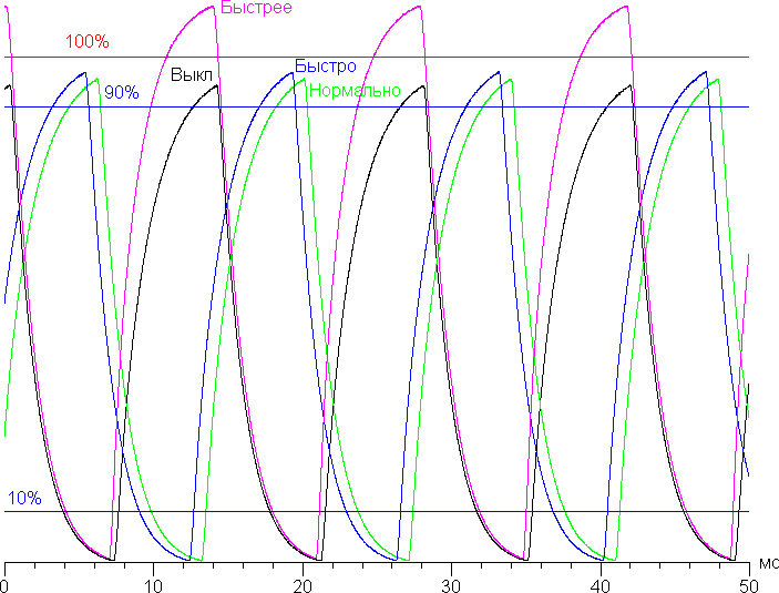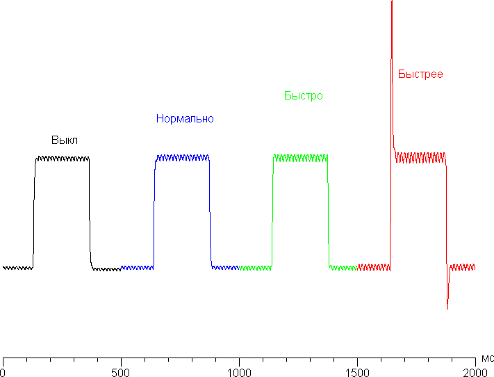 С нашей точки зрения, уже на предпоследнем уровне разгона скорости матрицы достаточно даже для самых динамичных игр. Приведем зависимость яркости (вертикальная ось) от времени (горизонтальная ось) при чередовании белого и черного кадра при 144 Гц кадровой частоты в случае четырех значений настройки Время отклика: