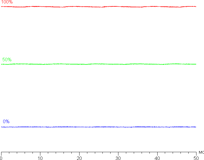 Яркость монитора меняется именно яркостью подсветки, то есть без ущерба для качества изображения (сохраняется контрастность и количество различимых градаций) яркость монитора можно менять в широких пределах, что позволяет с комфортом работать, играть и смотреть фильмы как в освещенном, так и в темном помещении, хотя для последнего случая минимальная яркость кому-то может показаться высоковатой. На любом уровне яркости значимая модуляция подсветки отсутствует, что исключает видимое мерцание экрана. Для тех, кто привык распознавать знакомое сокращение, уточним: ШИМ отсутствует. В доказательство приведем графики зависимости яркости (вертикальная ось) от времени (горизонтальная ось) при различных значениях настройки яркости: