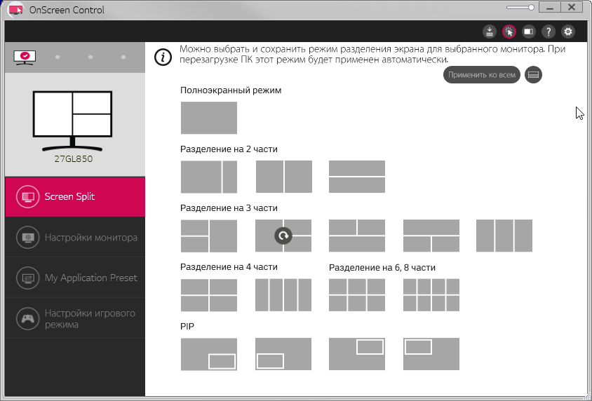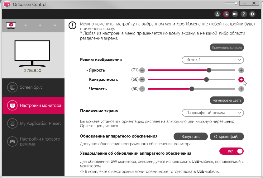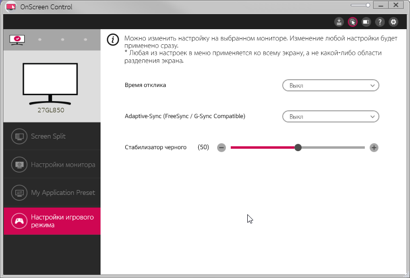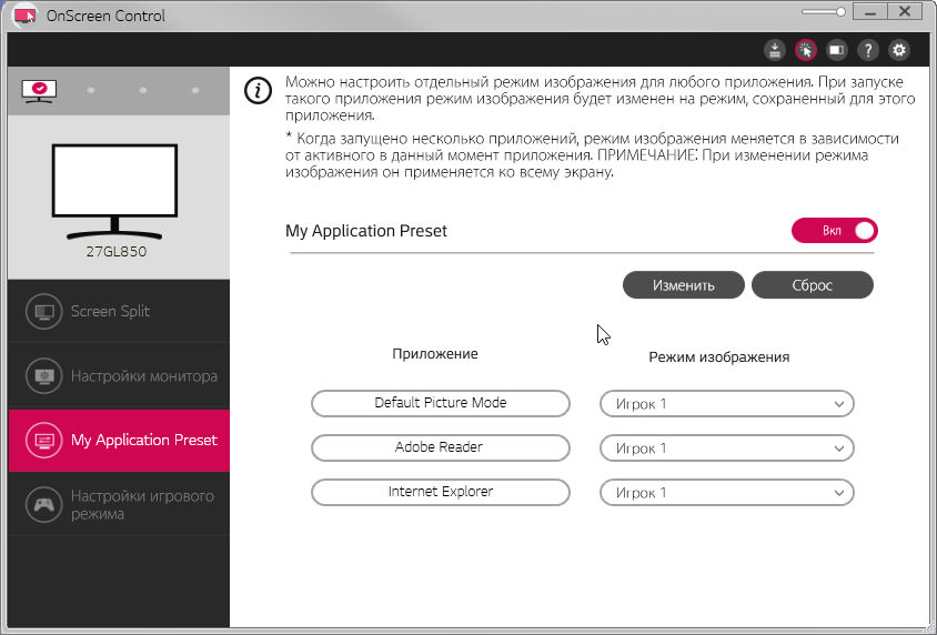 Комплект напечатанной документации включает в себя краткое (текст на русском языке есть) и полное руководства пользователя (на русском языке), отчет о калибровке, гарантийный талон и еще несколько вспомогательных документов. На CD-ROM из комплекта нет ничего полезного. На сайте производителя в разделе поддержки для этого монитора мы обнаружили ссылки на руководство, драйвер (файлы 27gl850.cat, 27GL850.icm и 27GL850.inf) и на программу OnScreen Control, которая помогает распределять окна программ на рабочем столе и позволяет настраивать монитор с компьютера, в том числе она может привязать профиль изображения к выбранному активному приложению.