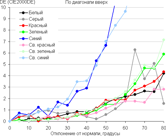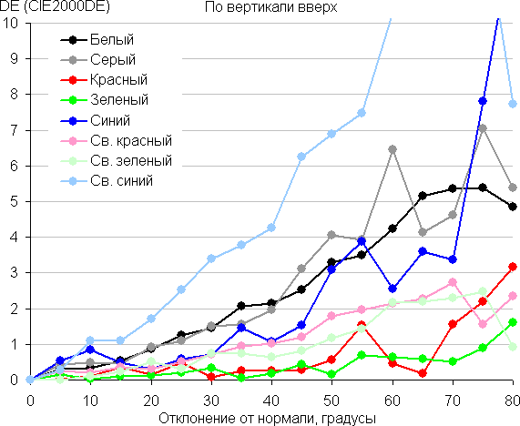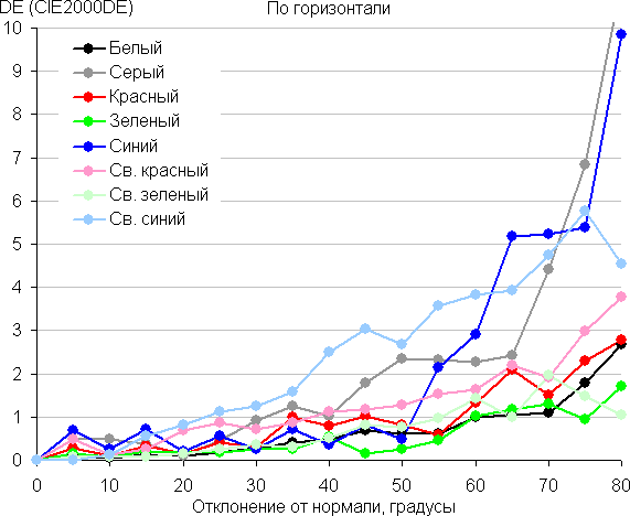 Для количественной характеристики изменения цветопередачи мы провели колориметрические измерения для белого, серого (127, 127, 127), красного, зеленого и синего, а также светло-красного, светло-зеленого и светло-синего полей во весь экран с использованием установки, подобной той, что применялась в предыдущем тесте. Измерения проводились в диапазоне углов от 0° (датчик направлен перпендикулярно к экрану) до 80° с шагом в 5°. Полученные значения интенсивностей были пересчитаны в ΔE относительно замера каждого поля при перпендикулярном положении датчика относительно экрана. Результаты представлены ниже: