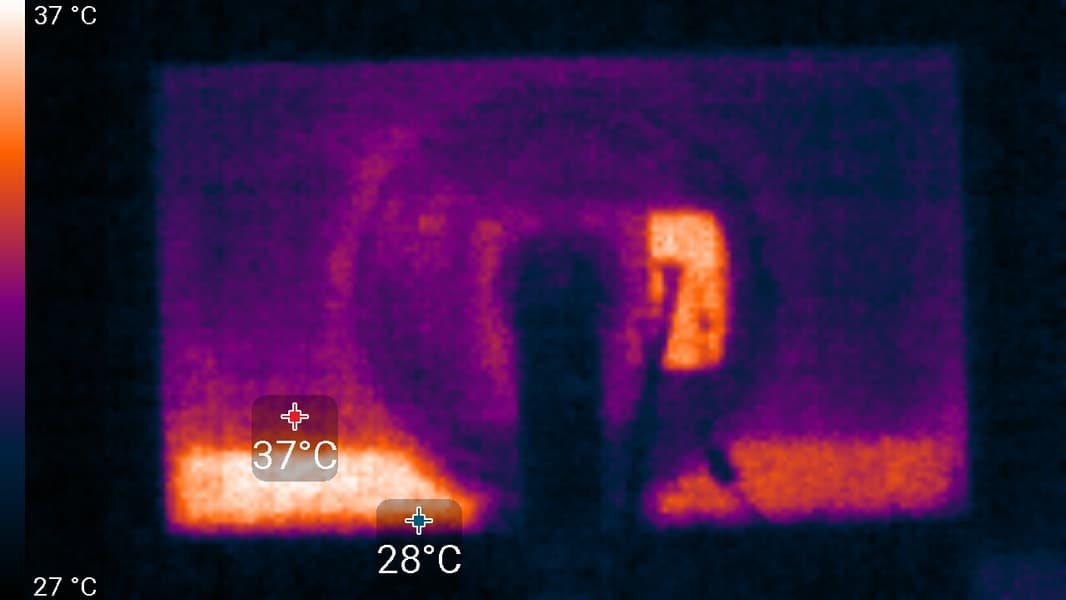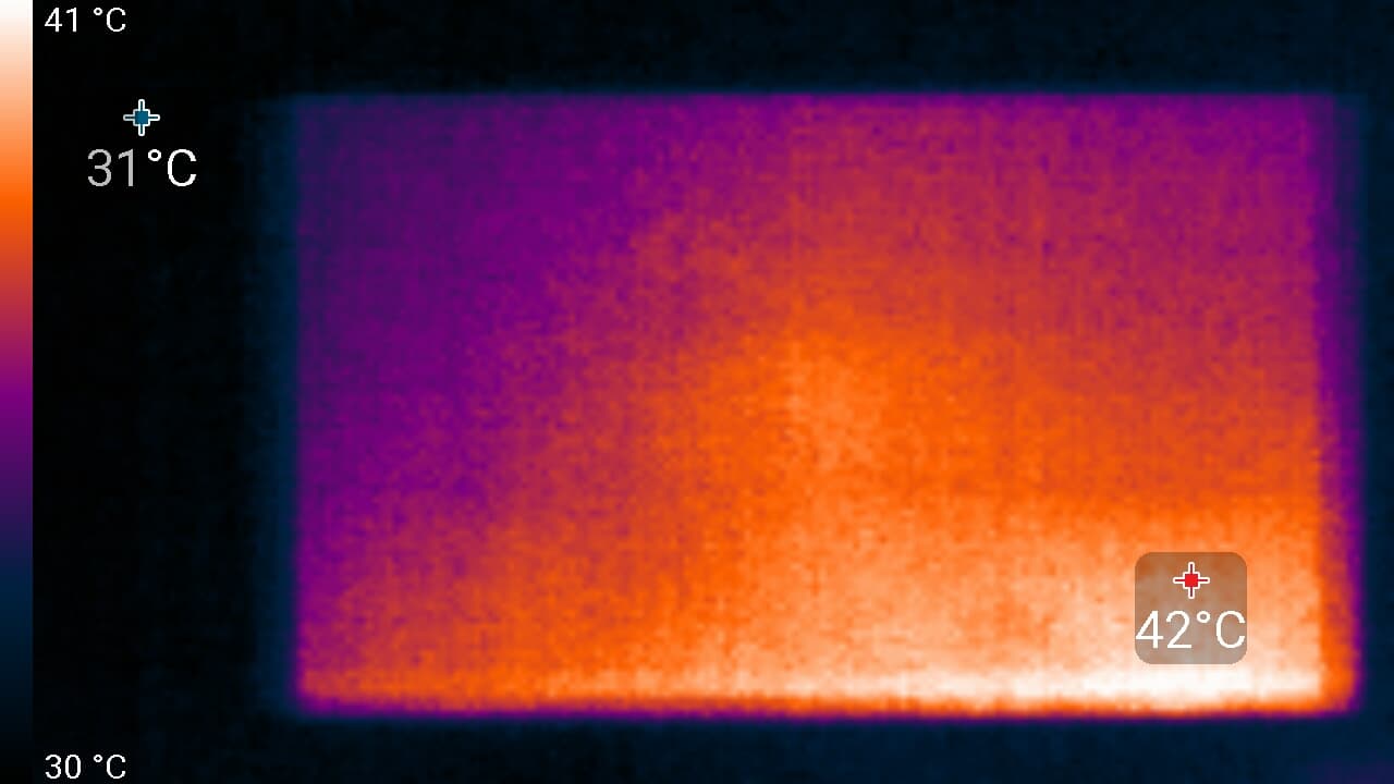 Нижний край экрана нагрелся до 42 °C максимум. Видимо, внизу находится светодиодная линейка подсветки экрана. Нагрев сзади умеренный: