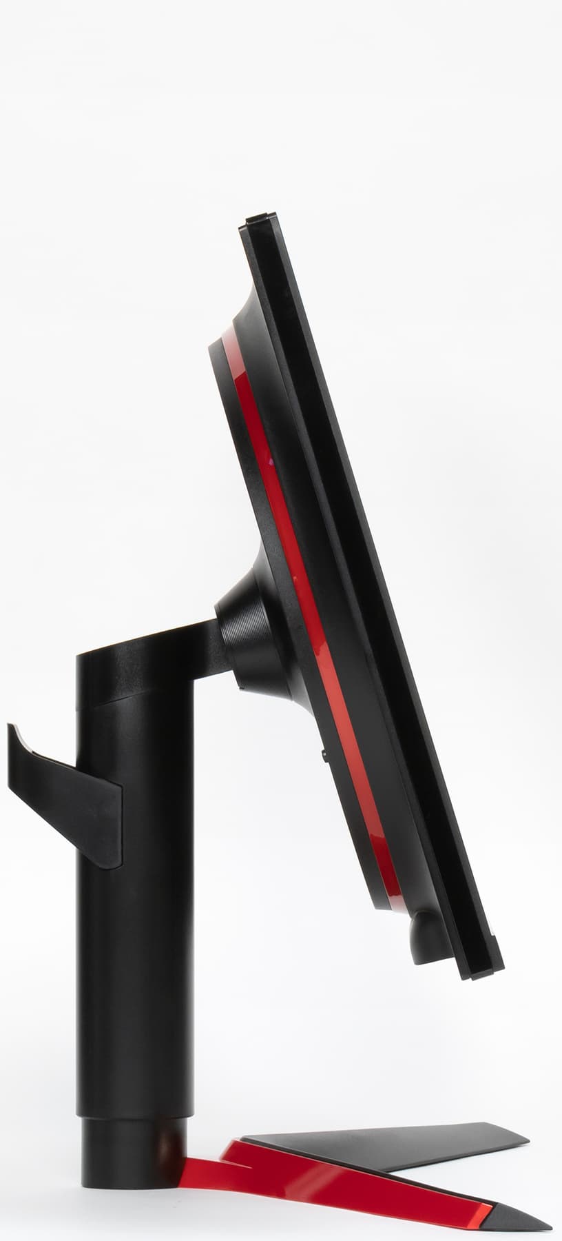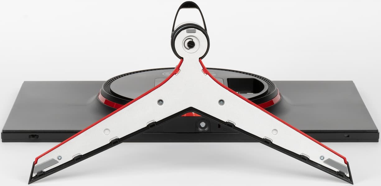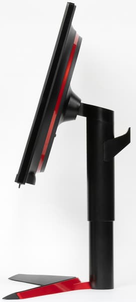 Панели корпуса блока экрана, а также кожухи подставки изготовлены из черного пластика в основном с матовой поверхностью. Но встречаются и глянцевые участки — логотип на задней панели и обрамление блока экрана. Умеренное разнообразие привносят вставки из красного пластика с глянцевой поверхностью. Внешняя поверхность матрицы черная, полуматовая, зеркальность выражена. Экран выглядит как монолитная поверхность, ограниченная снизу пластиковой планкой, а сверху и с боков — узкой пластиковой окантовкой. Выведя изображение на экран, можно увидеть, что на самом деле между внешними границами экрана и собственно областью отображения есть неширокие поля.