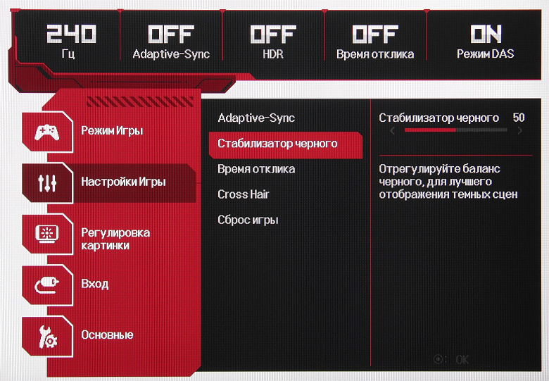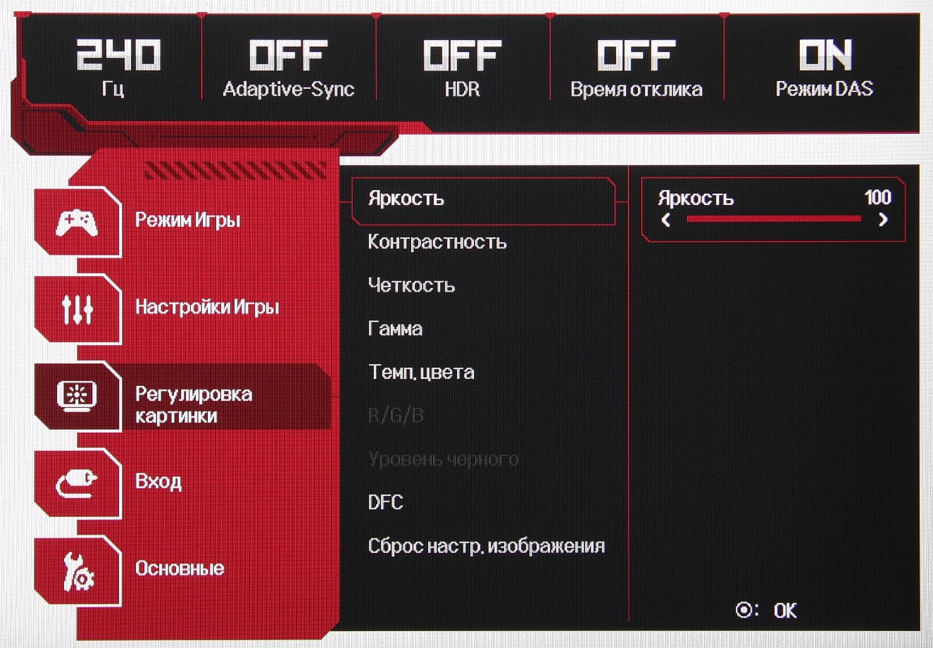 В дополнение к выбору профиля гамма-коррекции есть настройка, изменяющая различимость градаций в тенях, что может пригодиться в играх с темными сценами. Также можно регулировать разгон матрицы и включать/выключать режим FreeSync.