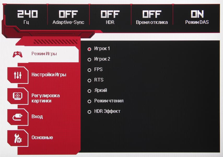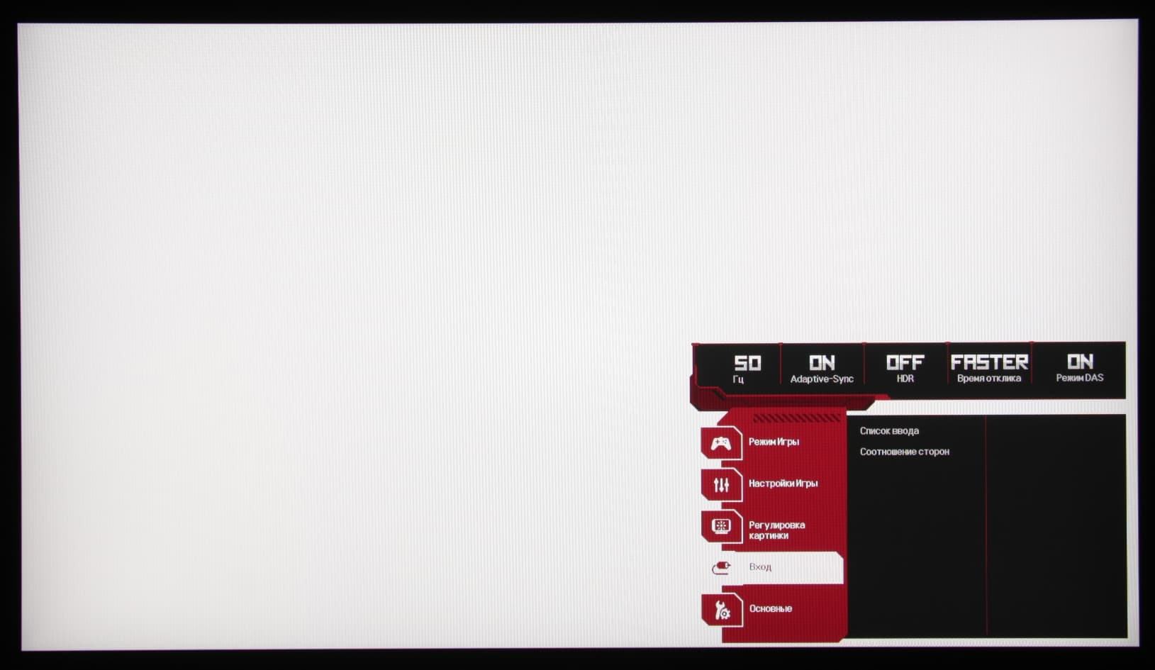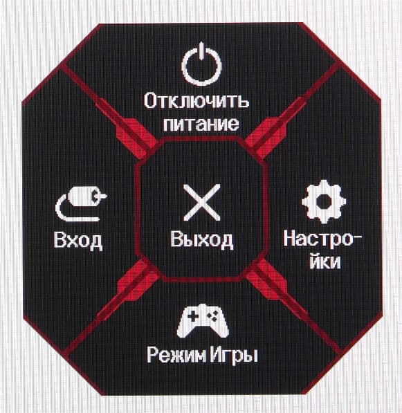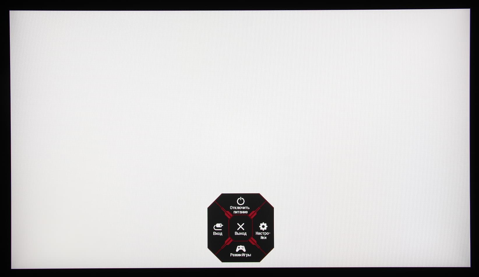 Длительное нажатие, когда нет меню, выключает монитор. Короткое — включает. Из стартового меню можно выйти, перейти к выбору входа, к основному меню, в список выбора игрового режима (профиля изображения), или выключить монитор. Меню занимает на экране значительную площадь, что иногда мешает оценке вносимых изменений.