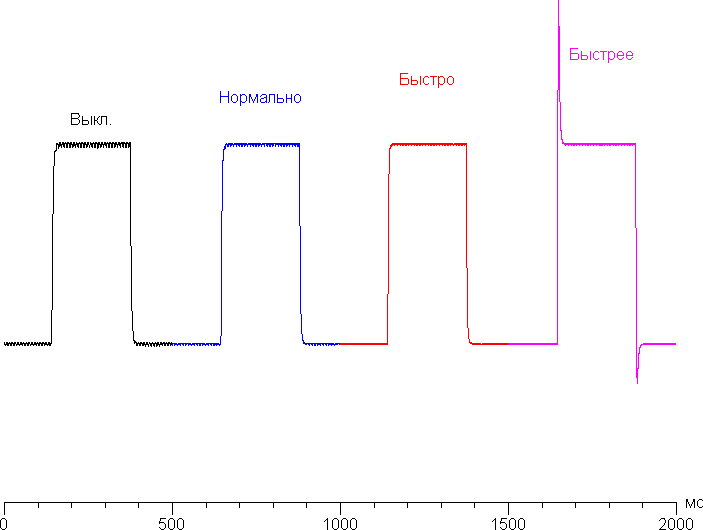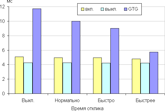 Время отклика зависит от значения одноименной настройки, которая управляет разгоном матрицы. График ниже показывает, как меняется время включения и выключения при переходе черный-белый-черный (столбики «вкл.» и «выкл.»), а также среднее суммарное (от первого оттенка до второго и обратно) время для переходов между полутонами (столбики «GTG»):