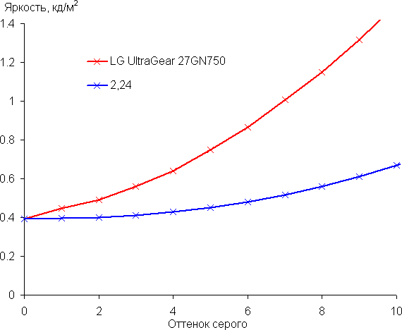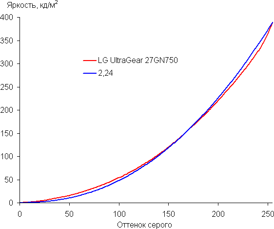 Аппроксимация (уже по 256 точкам) полученной гамма-кривой дала показатель 2,24, что немного выше стандартного значения 2,2, при этом реальная гамма-кривая заметно отклоняется от аппроксимирующей степенной функции: