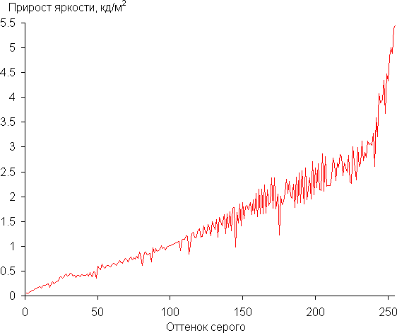 Отметим, что настройку Контрастность мы уменьшили до 69 (по умолчанию 70), так как при превышении этого значения наблюдался небольшой завал в светах. Реальная гамма-кривая ближе всего к стандартной при выборе Режим 1, поэтому далее мы измерили яркость 256 оттенков серого (от 0, 0, 0 до 255, 255, 255) при этом значении. График ниже показывает прирост (не абсолютное значение!) яркости между соседними полутонами: