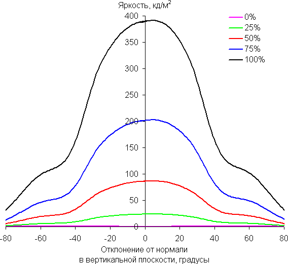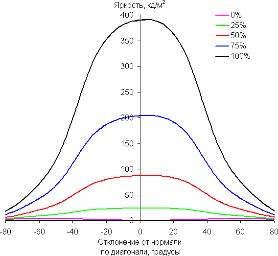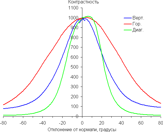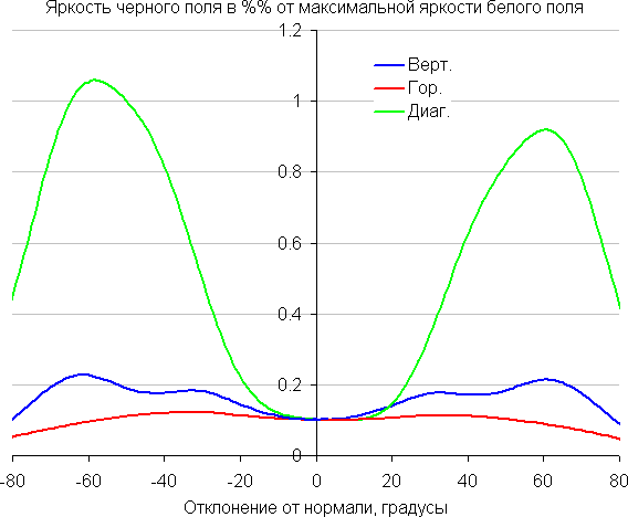 Отметим плавное уменьшение яркости при отклонении от перпендикуляра к экрану в горизонтальном направлении, при этом графики не пересекаются во всем диапазоне измеряемых углов. Чуть быстрее падает яркость при отклонении в вертикальном направлении. При отклонении в диагональном направлении поведение яркости оттенков имеет промежуточный характер между вертикальным и горизонтальным направлениями, за исключением яркости черного поля, которая начинает резко возрастать уже при 20°-30° отклонения от перпендикуляра к экрану. Если сидеть не очень далеко от экрана, то черное поле по углам будет заметно светлее, чем в центре. Контрастность в диапазоне углов ±82° в случае отклонения по диагонали приближается к отметке 10:1, но не опускается ниже.