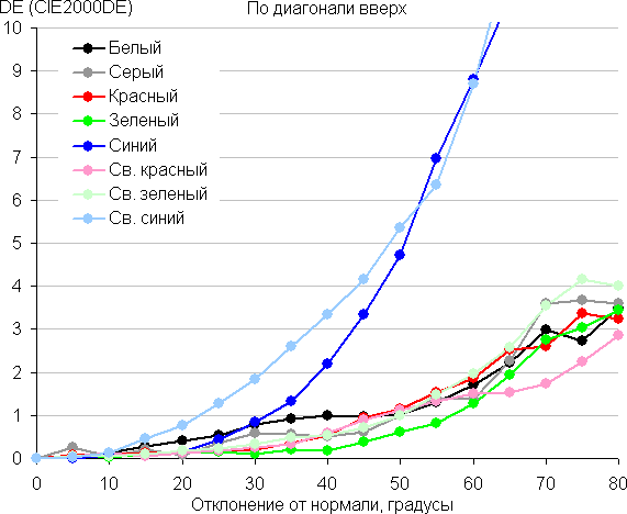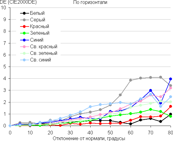 Для количественной характеристики изменения цветопередачи мы провели колориметрические измерения для белого, серого (127, 127, 127), красного, зеленого и синего, а также светло-красного, светло-зеленого и светло-синего полей во весь экран с использованием установки, подобной той, что применялась в предыдущем тесте. Измерения проводились в диапазоне углов от 0° (датчик направлен перпендикулярно к экрану) до 80° с шагом в 5°. Полученные значения интенсивностей были пересчитаны в ΔE относительно замера каждого поля при перпендикулярном положении датчика относительно экрана. Результаты представлены ниже: