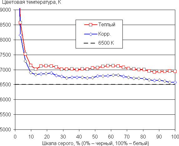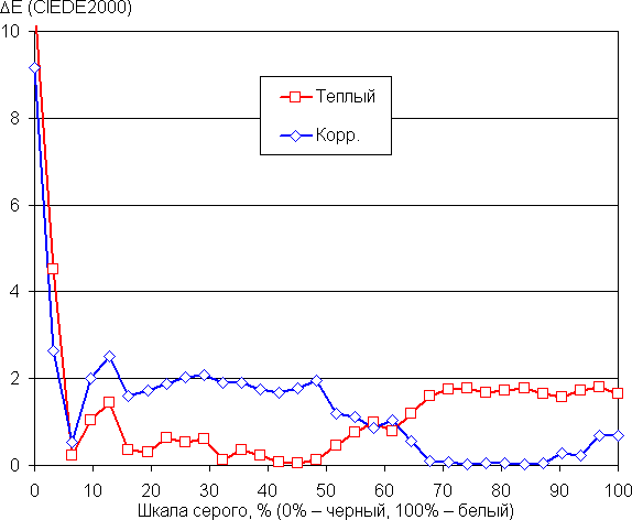 Самый близкий к черному диапазон можно не учитывать, так как в нем цветопередача не так важна, а погрешность измерения цветовых характеристик высокая. Ручная коррекция еще больше приблизила цветовую температуру к 6500 К и немного уменьшила значение ΔE на светлом участке шкалы серого. Впрочем, для бытового применения просто выбрать вариант Теплый уже достаточно.