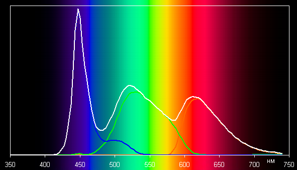 Такой спектр с относительно узким пиком синего и с широкими горбами зеленого и красного цветов характерен для мониторов, в которых используется белая светодиодная подсветка с синим излучателем и желтым люминофором.