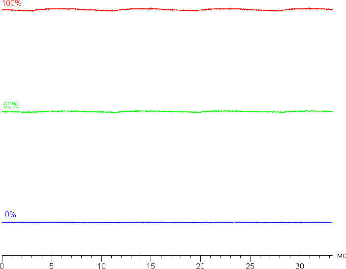 Яркость монитора меняется именно яркостью подсветки, то есть без ущерба для качества изображения (сохраняется контрастность и количество различимых градаций) яркость монитора можно менять в широких пределах, что позволяет с комфортом работать, играть и смотреть фильмы как в освещенном, так и в темном помещении. На любом уровне яркости значимая модуляция подсветки отсутствует, что исключает видимое мерцание экрана. Для тех, кто привык распознавать знакомое сокращение, уточним: ШИМ отсутствует. В доказательство приведем графики зависимости яркости (вертикальная ось) от времени (горизонтальная ось) при различных значениях настройки яркости: