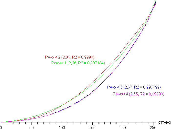 Реальная гамма-кривая зависит от выбранного профиля в списке Гамма (значения показателей аппроксимирующей функции приведены в скобках в подписях, там же — коэффициент детерминации R²):