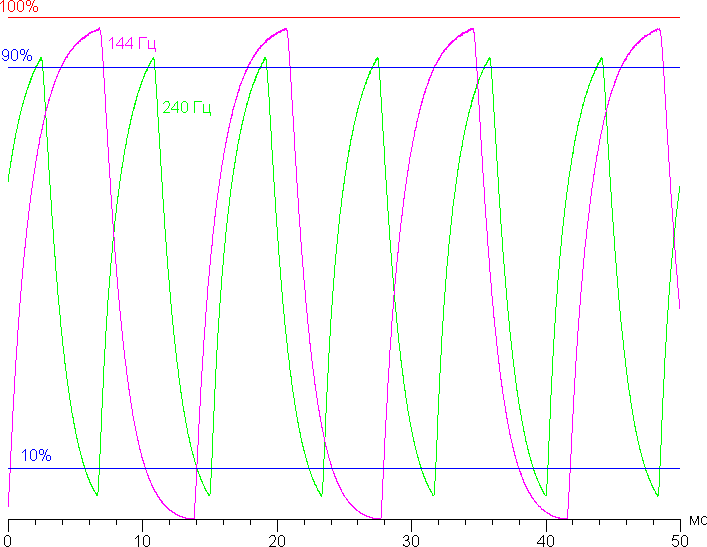 С нашей точки зрения, уже на предпоследнем уровне разгона скорости матрицы достаточно даже для самых динамичных игр. Приведем зависимость яркости (вертикальная ось) от времени (горизонтальная ось) при чередовании белого и черного кадра при 144 и 240 Гц кадровой частоты: