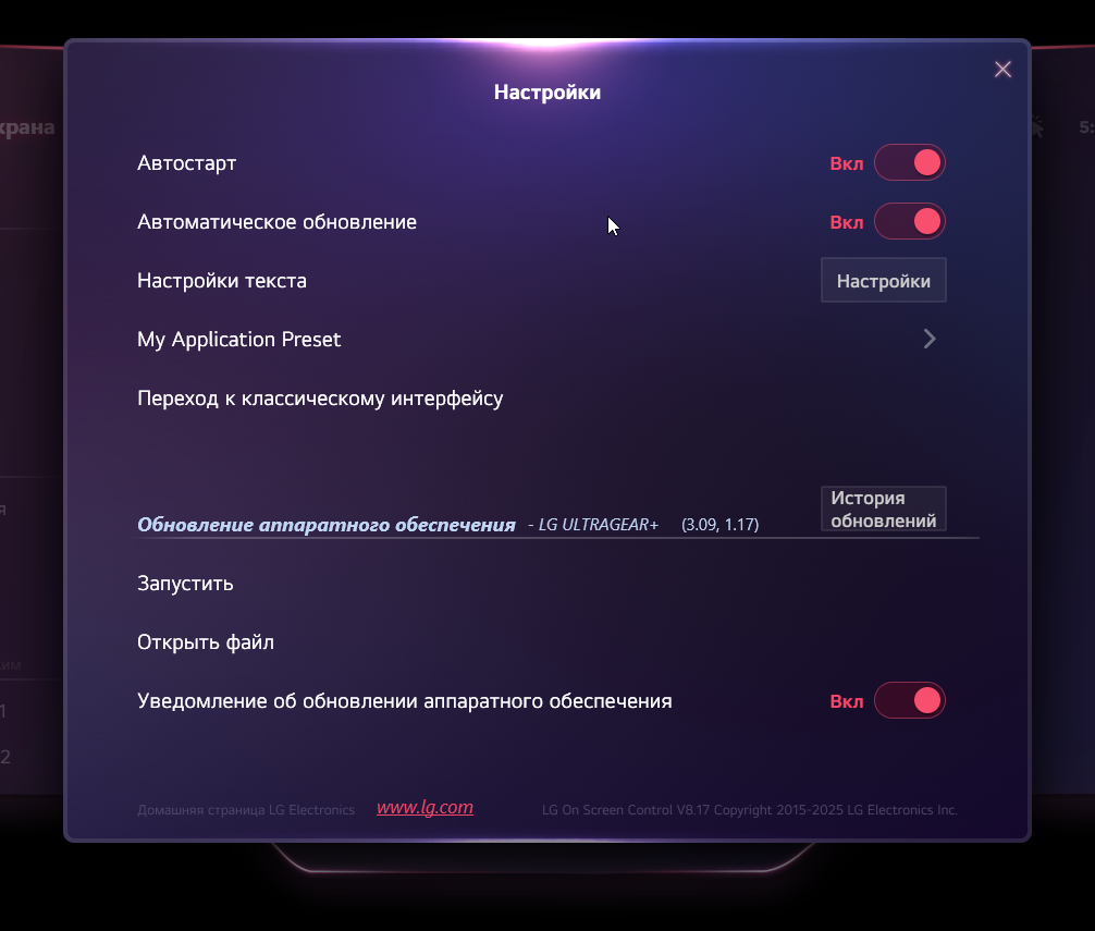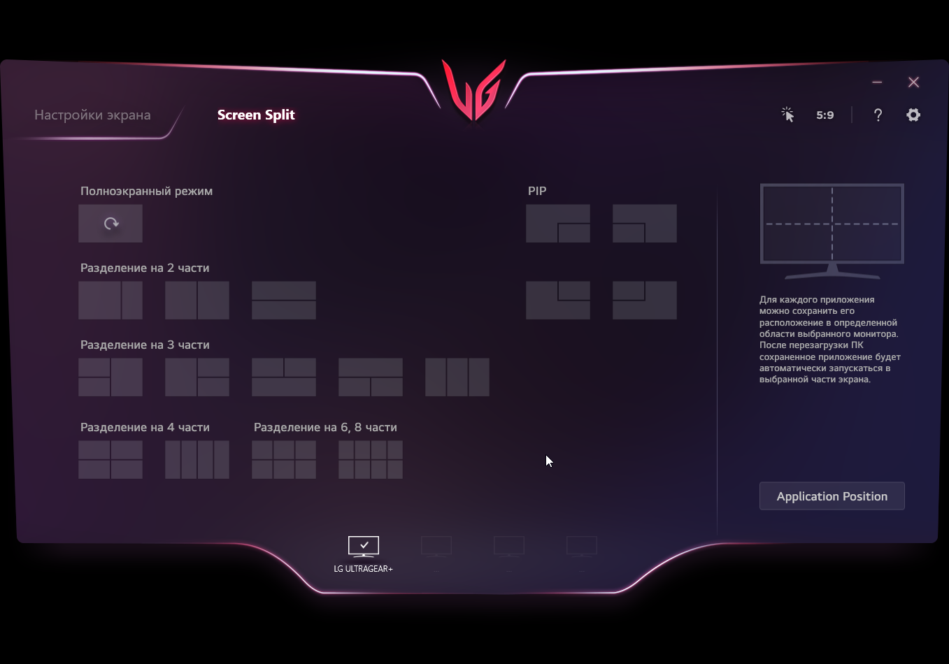 Поддерживается фирменная программа OnScreen Control, которая помогает распределять окна программ на рабочем столе, позволяет настраивать монитор с компьютера, в том числе она может привязать профиль изображения к выбранному активному приложению, а также отвечает за обновление микропрограммы монитора.
