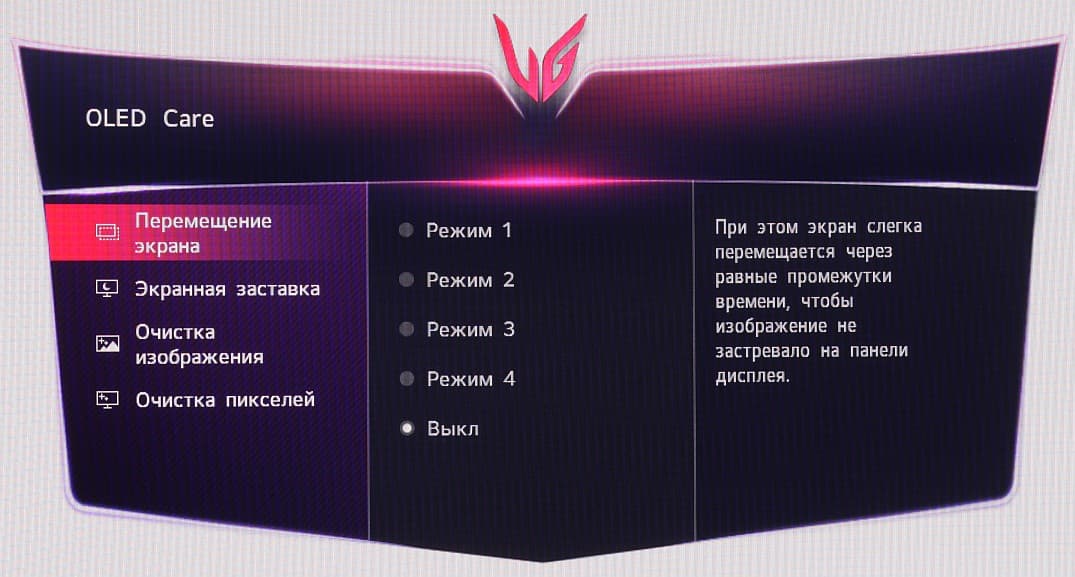 Отдельной кнопкой вызывается меню с функциями ухода за панелью OLED.