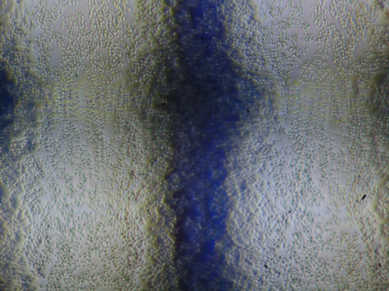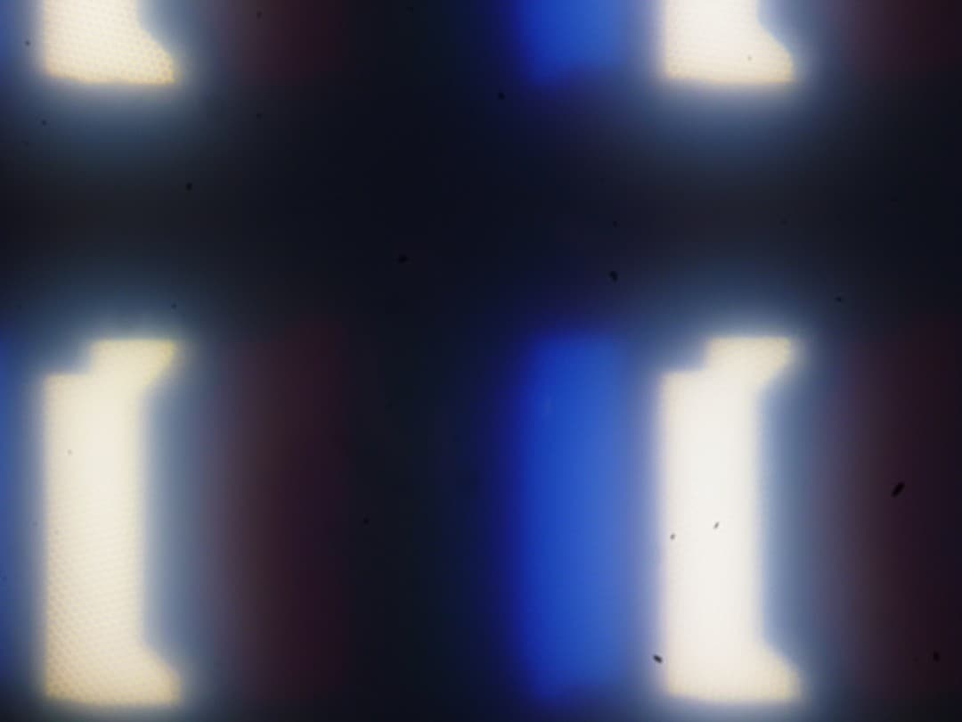 Фокусировка на поверхности экрана (фото справа выше) выявила хаотично расположенные микродефекты поверхности, отвечающие собственно за матовые свойства. Зерно этих дефектов в несколько раз меньше размеров субпикселей (масштаб этих двух фотографий одинаковый), поэтому фокусировка на микродефектах и «перескок» фокуса по субпикселям при изменении угла зрения выражены слабо, из-за этого нет и «кристаллического» эффекта.