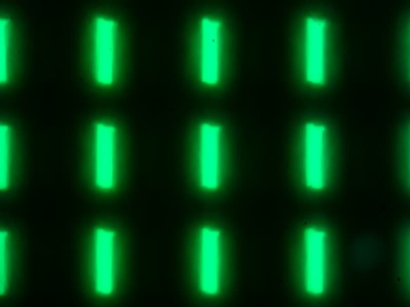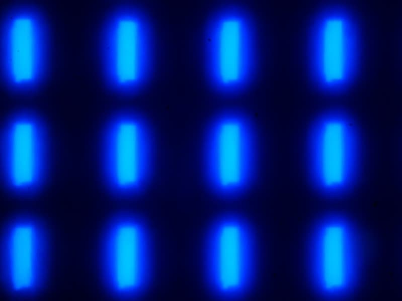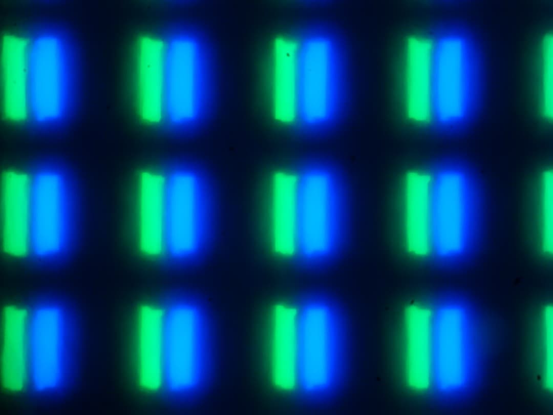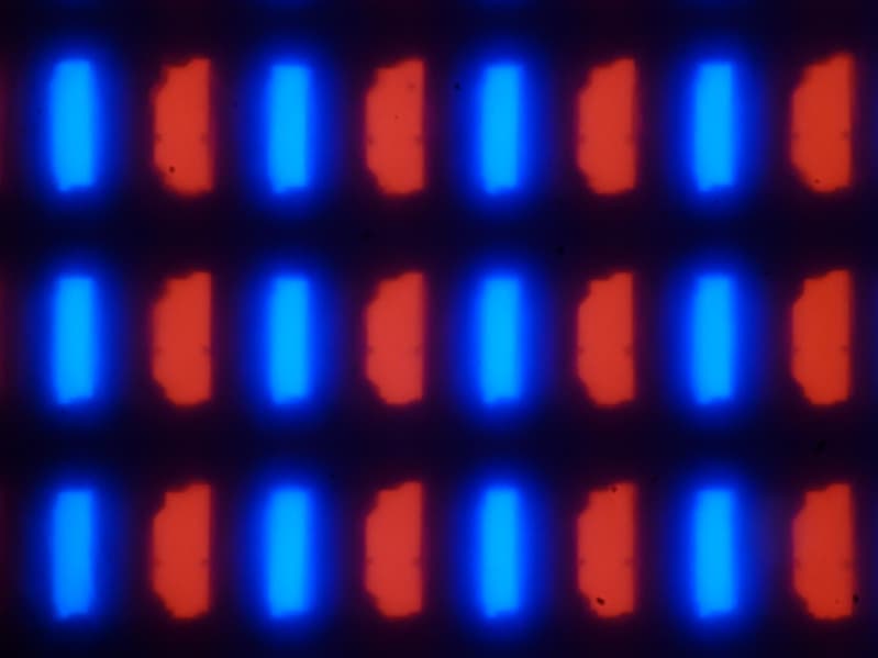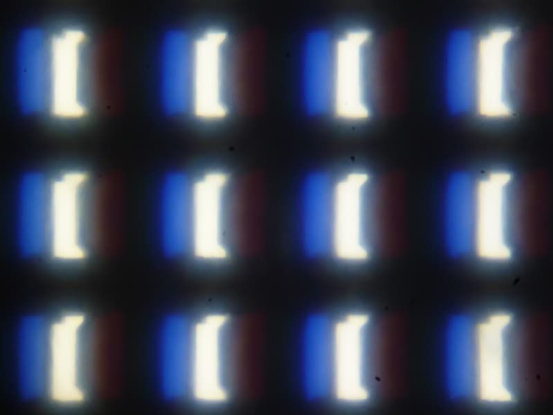 Видно, что светофильтры нанесены вертикальными полосками, как и в случае типичной ЖК-матрицы. При этом белый цвет в случае данного сочетания настроек формируется с участием синего субпикселя. Заметим, что из-за особенностей расположения субпикселей и формирования оттенков желтые объекты с четкими границами на белом фоне слева имеют выраженную красную кайму, а справа — зеленую. Также могут быть артефакты при отображении текста, если используется ClearType. Впрочем, ClearType можно отключить, или использовать альтернативные технологии для отрисовки шрифтов. Отметим, что обычный черный текст на белом фоне (или наоборот) без ClearType отображается без артефактов.