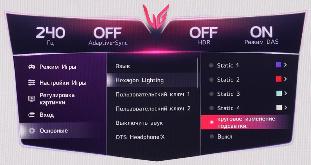 Подсветка, видимо, не поделена на независимо управляемые зоны, так как светодиод на нижнем торце и вставки сзади светятся везде одним цветом. В меню можно выбрать, каким именно цветом, или включить режим медленной циклической смены цвета.