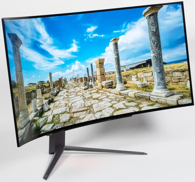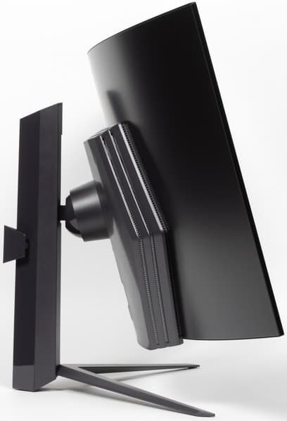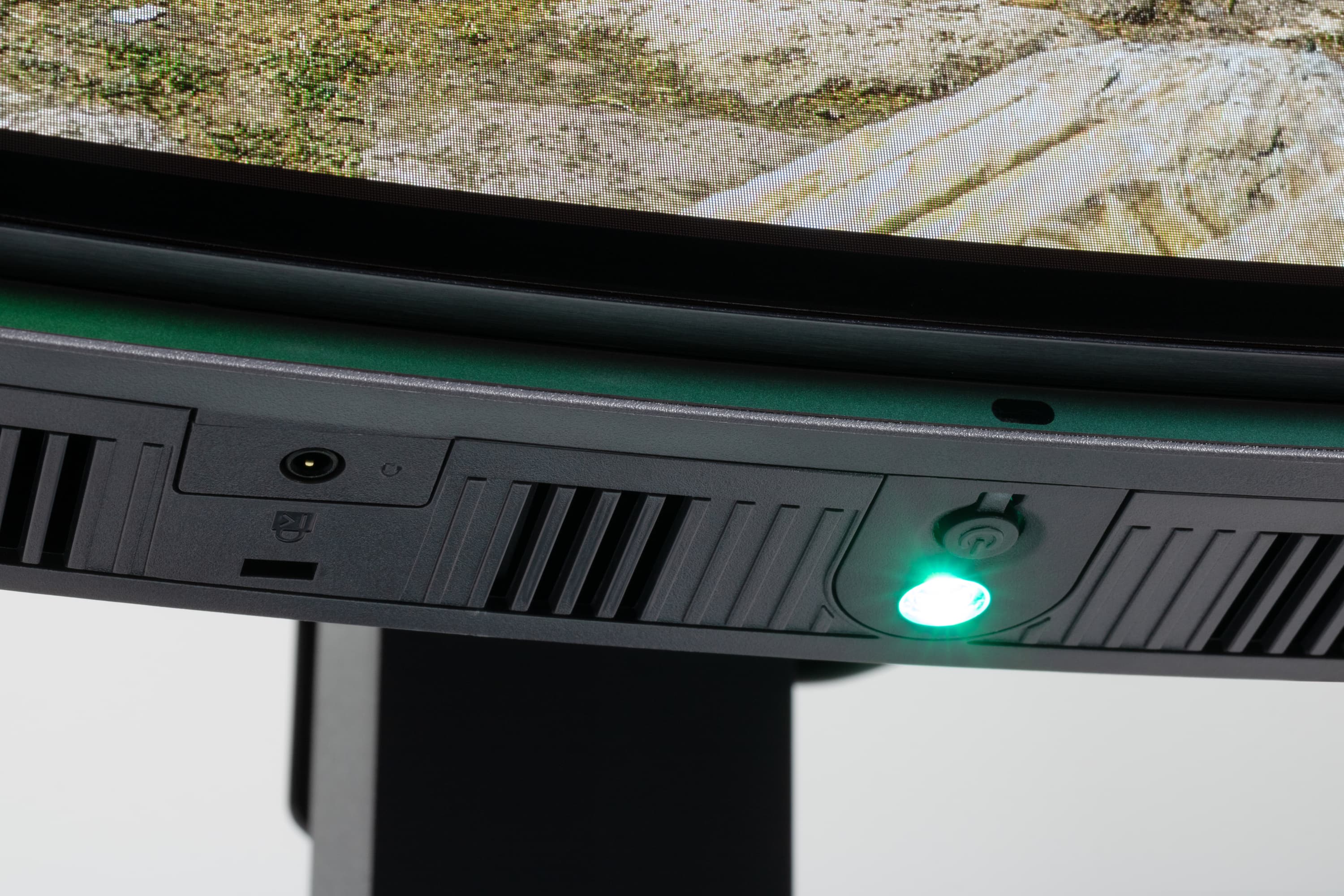 Плоскость экрана сильно изогнута по цилиндру (с заявленным радиусом кривизны 800 мм) так, что правый и левый край выдвинуты вперед. По отражению в экране видно, что изгиб более-менее равномерный на большей площади, его радиус порядка паспортного, и только по краям в вертикальной области всего около 3 см экран скорее плоский. Фронтальная поверхность экрана монолитная черная полуматовая (зеркальность отчасти присутствует), по периметру она ограничена узкой окантовкой из алюминиевого профиля. Выведя изображение на экран, можно увидеть, что между внешними границами экрана и собственно областью отображения есть неширокие поля (примерно по 9 мм сверху и по бокам и порядка 12 мм снизу). Специального антибликового покрытия (фильтра) нет.