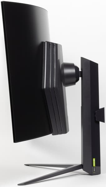 Стойка имеет фиксированную высоту. Шарнир с крепежной площадкой перемещается по алюминиевым хорошо смазанным направляющим, а в качестве подшипника используются вставки из пластика с малым коэффициентом трения. При этом пружинный механизм компенсирует вес блока экрана. Подставка на блок экрана крепится на защелках одним движением, а отсоединяется также просто, при удерживании кнопки фиксатора. Подставку можно отсоединить (или не подсоединять изначально) и закрепить блок экрана на VESA-совместимом кронштейне с отверстиями по углам квадрата со стороной 100 мм (но нужно проверить кронштейн на совместимость).