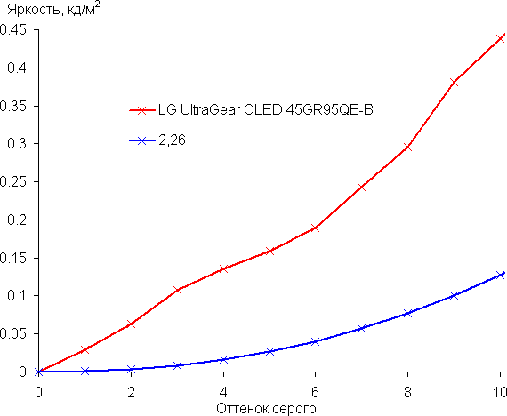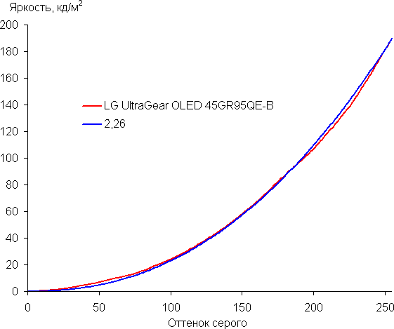 Аппроксимация (уже по 256 точкам) полученной гамма-кривой дала показатель 2,26, что немного выше стандартного значения 2,2, при этом реальная гамма-кривая немного отклоняется от аппроксимирующей степенной функции: