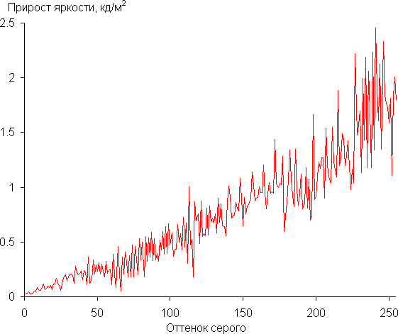 Реальная гамма-кривая ближе всего к стандартной при выборе Режим 2, поэтому далее мы измерили яркость 256 оттенков серого (от 0, 0, 0 до 255, 255, 255) при этом значении. График ниже показывает прирост (не абсолютное значение!) яркости между соседними полутонами: