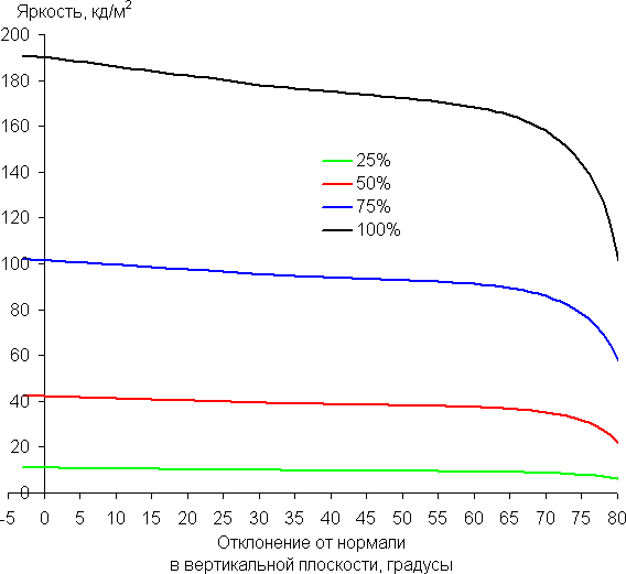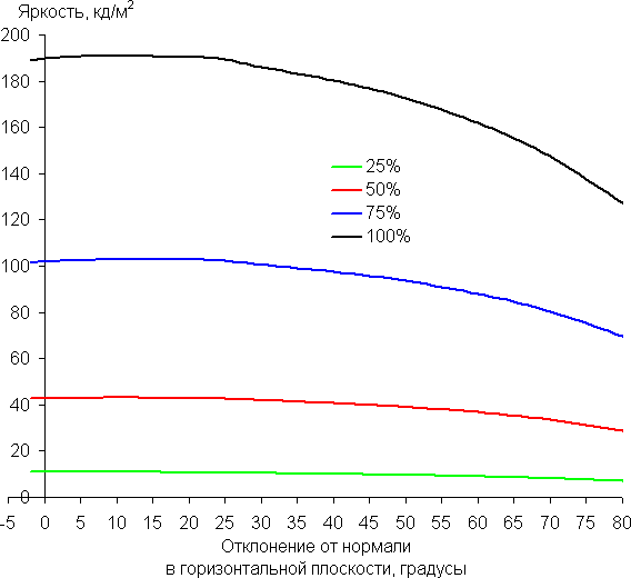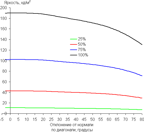 Чтобы выяснить, как меняется яркость экрана при отклонении от перпендикуляра к экрану, мы провели серию измерений яркости белого и оттенков серого в центре экрана в широком диапазоне углов, отклоняя ось датчика в вертикальном, горизонтальном и диагональном (из угла в угол) направлениях. Яркость черного поля по понятным причинам не определялась, как и контрастность.