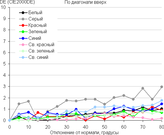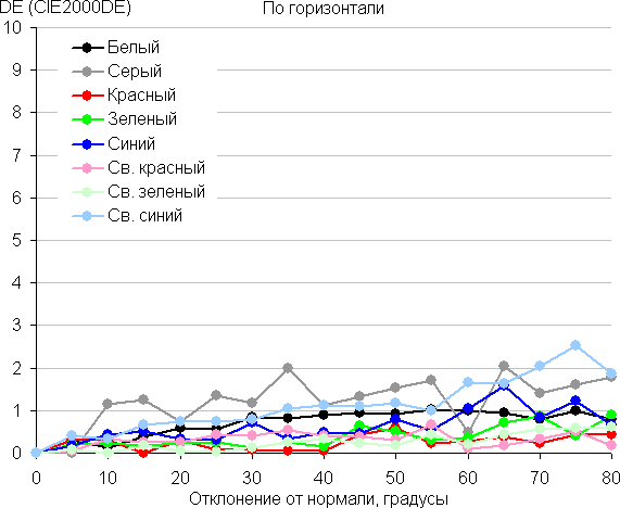 Для количественной характеристики изменения цветопередачи мы провели колориметрические измерения для белого, серого (127, 127, 127), красного, зеленого и синего, а также светло-красного, светло-зеленого и светло-синего полей во весь экран с использованием установки, подобной той, что применялась в предыдущем тесте. Измерения проводились в диапазоне углов от 0° (датчик направлен перпендикулярно к экрану) до 80° с шагом в 5°. Полученные значения интенсивностей были пересчитаны в отклонение ΔE относительно замера каждого поля при перпендикулярном положении датчика относительно экрана. Результаты представлены ниже: