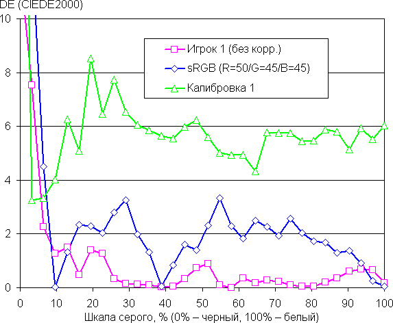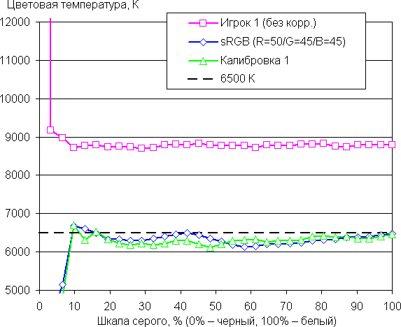 Мы задали стандартные параметры — цветовая температура 6500 К, гамма 2,2, цветовой охват sRGB и максимальную яркость, — после чего выполнили калибровку с сохранением результатов в профиле Калибровка 1. В качестве альтернативы мы выбрали профиль sRGB в настройках монитора и подправили цветовой баланс настройками усиления трех цветов. Графики ниже показывают цветовую температуру на различных участках шкалы серого и отклонение от спектра абсолютно черного тела (параметр ΔE) в случае профиля Калибровка 1 и при выборе профиля sRGB с коррекцией. Для сравнения также приводим результаты в случае профиля Игрок 1 без какой-либо коррекции: